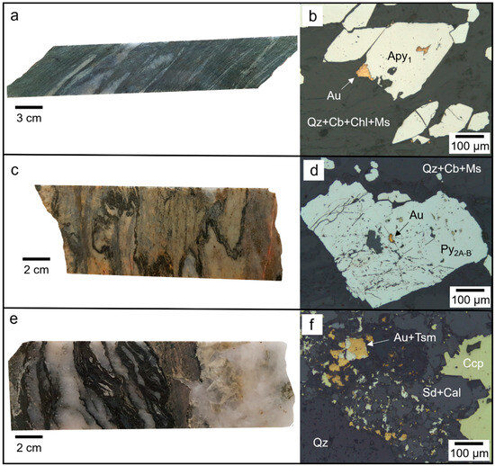 Styles of gold mineralization in the WGC: (a,b) D1 chlorite + muscovite + quartz + carbonate schist with bands of fine-grained disseminated arsenopyrite that host gold; (c,d) D2 quartz + muscovite + carbonate schist hosting porphyroblastic Py2 with inclusions of gold; (e,f) D3 quartz + tourmaline + carbonate vein with late carbonate-rich assemblages that host gold with chalcopyrite and Bi-Te minerals (in this case, tsumoite). (b,d,f) are reflected-light photomicrographs. Additional abbreviations: Au = gold; Apy = arsenopyrite; Py = pyrite; Cb = carbonate; Chl = chlorite; Ms = muscovite; Sd = siderite; Ccp = chalcopyrite; Tsm = tsumoite (BiTe).