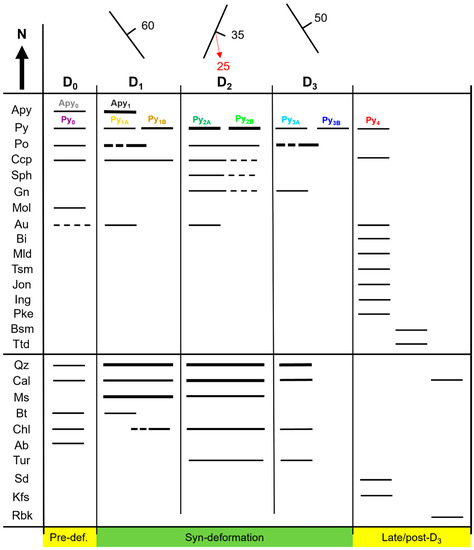 Hydrothermal mineral paragenesis for the WGC. The strike–dip symbols represent the dominant orientation of the foliations in the shear zones formed during each deformation event, and the red arrow denotes a stretching lineation. The relative thickness of the lines corresponds to the relative abundance of the mineral phases. Additional abbreviations: Ab = albite; Bt = biotite; Gn = galena; Mol = molybdenite; Pke = parkerite.