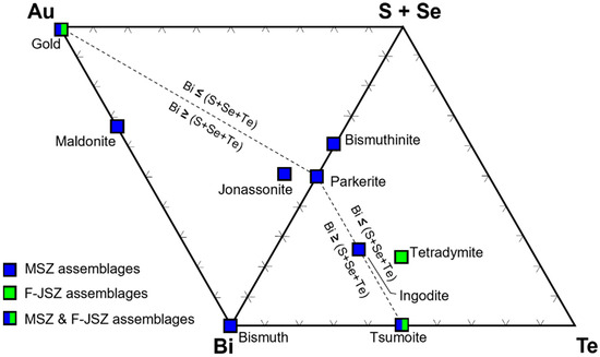 The final considerations are physicochemical in nature, as numerous studies have demonstrated that parameters like fO2, fTe2, and aH2S impact the proportions of Bi relative to Te, S, and Se in minerals containing these elements [5,18,33,73]. More specifically, minerals with Bi ≤ (Te + Se + S) form under relatively high fO2-aH2S conditions (pyrite-stable), whereas those with Bi ≥ (Te + Se + S) form under relatively low fO2-aH2S conditions (pyrrhotite-stable). Tsumoite (BiTe) may form under either pyrite- or pyrrhotite-stable conditions [5]. The F-JSZ assemblages (e.g., tsumoite and the tetradymite; BiTe and Bi2Te2S, respectively) have stoichiometries with Bi ≤ (Te + Se + S), whereas MSZ assemblages (e.g., bismuth, maldonite, jonassonite, ingodite, parkerite; Bi, Au2Bi, AuBi5S4, Bi2TeS, and Ni3Bi2S2, respectively) have stoichiometries with Bi ≥ (Te + Se + S) (Figure 11). The only exception in the MSZ assemblages is bismuthinite (Bi2S3), which post-dates the other MSZ assemblage minerals. It could therefore be posited that these different bulk compositions reflect different fO2-aH2S conditions in the two environments. However, the consistency in the composition of the gangue minerals in the two environments (dominantly siderite, Py4, and chalcopyrite) does not point to significant differences in these parameters. It remains possible that the differences in fO2 and aH2S between the footwall of the JSZ and the MSZ were large enough to impact the stability of the LMCE-bearing phases without affecting the stability of the gangue phases, but additional data would be required to test this (e.g., fluid inclusion studies). Conversely, it is reasonable to suggest that fTe2 in the F-JSZ environment was higher than in the MSZ environment, given the higher availability of Te in the F-JSZ sulphides (as discussed above).