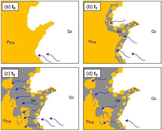 Cartoon illustrating the interpreted evolution of the pyrite–siderite replacement reaction with time. The blue arrows denote the direction of the progression of the hydrothermal fluid (starting from the outer rim of the Py3B bleb and moving inwards). The number of blue arrows corresponds to the relative amount of hydrothermal fluid in the system (and thus fluid flux, as discussed in the text). The sketch is based on the image presented in Figure 4j. See text for descriptions of each stage (a–d).