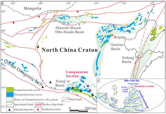 (A) Global paleographic reconstruction of late Ediacaran (580–530 Ma), modified from [15]; (B) simplified geological map showing the Meso-Neoproterozoic strata in the NCC, modified from [18,19].