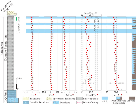 Because the Fepy fraction is typically transformed into immobile iron oxides preserved near the original pyrite during chemical weathering and the Fepy/FeHR and FeHR/FeT show no statistical correlation despite pyrite weathering [48,49], the FeHR/FeT is thought to be basically unaffected by modern oxidative weathering and can be used as a redox proxy despite evidence of secondary oxidative weathering [49]. The FeHR/FeT for the Dongpo Formation of the Luoquancun section ranges from 0.19 to 0.49 (mean = 0.33), fluctuating around the upper threshold of 0.38, and in combination with low Fepy/FeHR ratios (~0), it revealed rapid oscillations between anoxic–ferruginous and oxic local bottom water column redox conditions (Figure 3). Considering that a part of the samples with FeHR/FeT ratios below 0.38 was plotted between 0.22 and 0.38, which also could be indicative of anoxic conditions, the measured iron speciation data, therefore, probably suggested a dominantly anoxic late Ediacaran ocean punctuated by multiple transient oxygenation events across the southern margin of the NCC.
