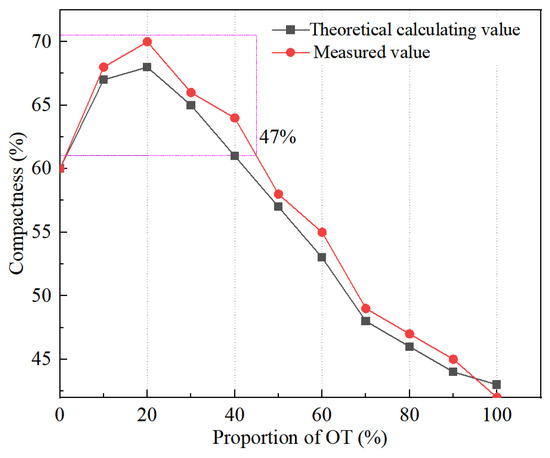 The relationship between the density of mixed tailings and the percentage of OT is shown in Figure 2. The compactness is large when the proportion of OT is less than 47%, and the compactness is the largest when the proportion of OT is 20%. The compactness test was utilized for indoor verification, as evidenced by the measured curve in Figure 2. The findings indicate a fundamental concurrence between the two.