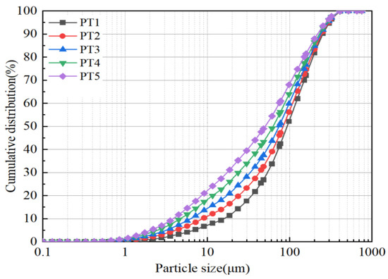 According to the maximum density theory, the proportions of OT in this test were determined to be 8%, 16%, 23%, 31% and 39%, respectively, which were recorded as PT1, PT2, PT3, PT4 and PT5. The LMS-30 laser particle size analyzer was used to analyze the particle size, and the results are shown in Figure 3. At the same time, the characteristic values of the tailings particle size d10, d30, d50, d60, d90 and dav (average particle size) were obtained, and the non-uniformity coefficient Cu and curvature coefficient Cc of various tailings were calculated. The results are shown in Table 3. The results show that the particle size characteristic values of all kinds of tailings are different. At the same time, the Cu of all kinds of tailings is greater than 5, and the Cc is between 1 and 3.