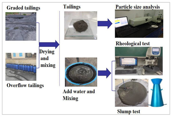 With the continuous development of the global economy and increasing resource consumption, the exploitation of metal mine resources has been on a steady rise. The extraction of valuable minerals from extracted ores results in the generation of a significant volume of tailings. According to statistics, the global annual production of tailings exceeds 14 billion tons [1,2]. For the disposal of tailings in the mine, the conventional approach primarily involves storing a portion of the tailings as a slurry, with a mass fraction ranging from 10% to 30% in a designated tailings reservoir, while another portion is mixed with specific proportions of cementitious materials for filling underground goafs. The filling mining method poses challenges in achieving a harmonious balance between mining and filling and fails to effectively mitigate the disasters caused by tailings reservoirs [3,4]. In order to mitigate the risk posed by the tailings reservoirs, the extracted waste rock is crushed to a specific particle size and utilized as a construction material. The ultra-fine tailings discharged to the tailings reservoir are concentrated to a high concentration tailings slurry with a mass concentration of about 65%. The hydraulic characteristics of the ultra-fine tailings slurry can be modified by incorporating a certain proportion of graded tailings to satisfy the requirements for underground non-cemented filling. The slurry of mixed tailings is discharged into the void created by mining waste rock. This method can effectively mitigate the risk associated with tailings reservoirs [5,6]. The success of underground backfilling largely depends on the pumpability and fluidity of the tailings slurry. The rheological properties of paste describe the physical process of liquid flow and deformation. The relationship between the shear strength and shear rate is usually described by the variation in the shear strength with the shear rate and fitted by relevant rheological models. The relationship between the shear strength and shear rate is characterized by the yield stress and plastic viscosity [7,8,9]. The selection of pumping equipment or self-flow characteristics is determined by the calculation of the rheological properties of the slurry. The impact of the tailings particle size distribution on rheological parameters should not be underestimated. Accurate testing of rheological parameters for the tailings slurry is crucial in designing a filling system and achieving successful tailings filling [10,11,12,13,14].