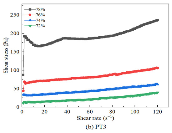 As shown in Table 4, the change in the tailings particle gradation and mass concentration has a significant effect on the rheological parameters of the slurry. The curve of the shear stress of the tailings slurry with the shear rate is shown in Figure 5. When the mass concentration is 76% and 78%, the shear stress of the PT1 and PT3 tailings slurry increases rapidly with the increase in the shear rate, that is, significant stress overshoot occurs, and the static yield stress of the PT1 tailings slurry is significantly lower than that of the PT3 tailings slurry. The reason is that, with the increase in the the proportion of OT, the smaller the particle size of the tailings, the denser the floc network structure between the particles. This results in an increase in the static yield stress, as a higher shear stress is required to disrupt the internal structure of the slurry [35]. However, when the slurry concentration is 72~74%, there is no obvious stress overshoot phenomenon, indicating that the change in mass concentration has a more significant effect on the rheological properties of the slurry than the tailings particle gradation.