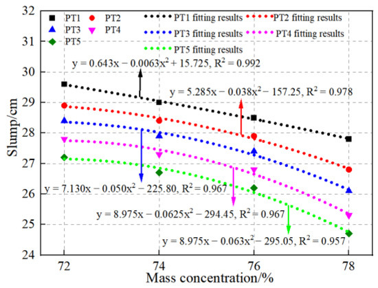 According to the findings in Table 4, it is evident that as the mass concentration increases, there is a noticeable decrease in the slump when keeping the tailings particle gradation constant. Therefore, the increase in the mass concentration will have an adverse effect on the flow performance of the slurry. In order to quantify the relationship between the mass concentration and slump, the variation in the slump with the mass concentration of different types of tailings slurries is drawn, as shown in Figure 6. The results show that the slump of the tailings slurry exhibits a quadratic function with the increase in the mass concentration and shows a decreasing trend, The relative error between the fitting results and the measured values is between −9.07% and 7.02%, and the correlation coefficient of the fitting results is R2 ≥ 0.957. For different types of tailings, the mass concentration of the slurry increased from 72% to 78%, and the slump decreased by 6.08%, 7.27%, 8.10%, 8.99% and 9.19%, respectively. With the decrease in the tailings particle size, the decrease in the slurry slump also gradually increases, indicating that the sensitivity of the tailings slurry slump to the mass concentration increases with the decrease in the tailings particle size. The increase in the slurry mass concentration means that the mixing water decreases continuously, which makes the spacing between the particles gradually decrease, enhances the cohesion between the particles and then reduces its flow performance. In addition, when the mass concentration is fixed, the slump index of the PT1 tailings slurry is the highest, followed by PT2, PT3 and PT4, and the worst is the PT5 tailings slurry. The reason is that as the fine particles of the tailings slurry gradually increase, the lubrication effect of the fine particles is weakened, resulting in the formation of a large number of flocculent network structures between the fine particles, which increases the flow resistance of the tailings particles and further deteriorates its flow performance [36].