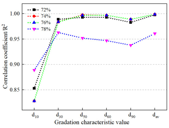 Combined with the data in Table 4, the least square method is calculated according to the correlation equation, and the fitting results of various tailings slurries are obtained. Due to the limited space, this analysis only listed the fitting results of the mass concentrations of 72% and 74%, as shown in Table 7. At the same time, the variation in the fitting correlation coefficient R2 with the characteristic particle size value is obtained, as shown in Figure 9. It can be seen in Table 7 that the correlation coefficient between the slump of the tailings slurry and the characteristic particle size value exceeds 0.80 at different mass concentrations, indicating that the slump of the tailings slurry is extremely correlated with the particle size characteristics. When the mass concentration is 72%, the correlation coefficient between the slump and d10 is 0.853, and the two are extremely correlated. With the increase in the characteristic particle size, the correlation coefficient shows an increasing trend, indicating that the correlation between the two increases with the increase in the characteristic particle size. When the mass concentration is 78%, the correlation coefficient between the slump and d10 is 0.828, and the two are also extremely correlated. However, with the increase in the characteristic particle size, the correlation coefficient shows a trend of increasing first, then decreasing and then increasing, indicating that the correlation degree between the slump and the characteristic particle size is also related to the mass concentration range of the slurry. It can be seen in Figure 9 that when the mass concentration is fixed, the correlation coefficient increases with the increase in the characteristic particle size, indicating that the correlation between the slump and the characteristic particle size is also gradually enhanced. However, the slump of the tailings slurry with a mass concentration of 78% has the lowest correlation coefficient with d30, d50, d60, d90 and dav, indicating that the increase in concentration will weaken the correlation between the slump of the tailings slurry and the characteristic particle size.