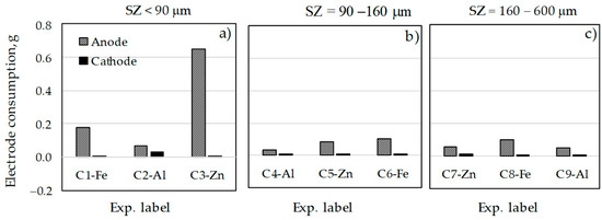 Electrode consumption during ECZ experiments with different SZ particle sizes: (a) <90 μm; (b) 90−160 μm; (c) 160−600 μm.