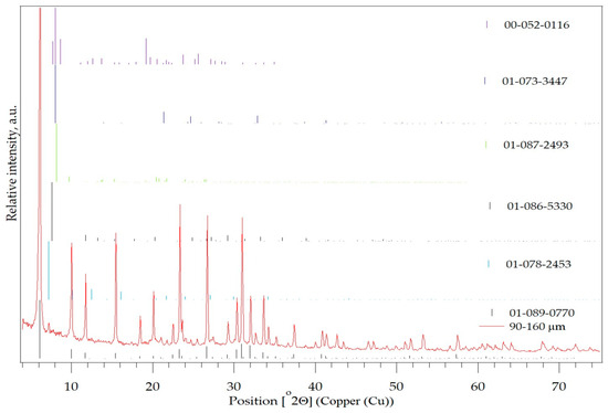 The diffraction pattern of the parent SZ zeolite with a particle size of 90–160 µm is shown in Figure 3 and Table 3. The most dominant structurally ordered phase belongs to the compound sodium potassium aluminium silicate hydrate, which belongs to the FAU-Faujasite family according to the zeolite classification.