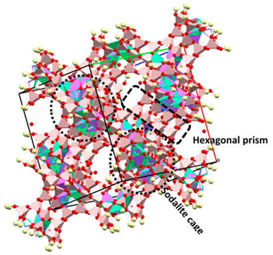 Figure 4 shows the simulated 3D structure of faujasite (FAU) prepared using the Mercury and the structure CIF file AMSD 0000128. The FAU framework is built on the basis of fused double six rings called hexagonal prisms and sodalite cages also called β-cages [62]. FAU crystalize in the space group Fd3m with the parameter of unite cell a = b = c = 25.104 Å and α = β = γ = 90°. The general composition of the faujasite is (Na2,Ca, Mg)29[Al58Si134O384]240H2O [63].