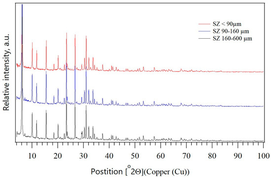 PXRD patterns of the SZ zeolite of three particle sizes: <90 µm, 90–160 µm, and 160–600 µm.