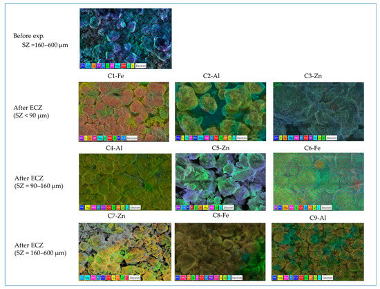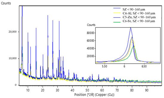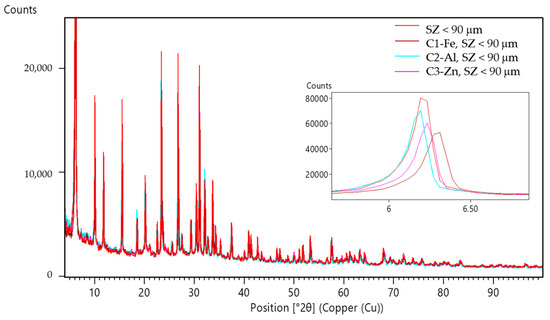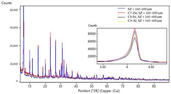 The PXRD patterns (Figure 6) of the SZ zeolite specimens where particle size was <90 µm in experiments C1 (ECZ-Fe), C2 (ECZ-Al), and C3 (ECZ-Zn) after the ECZ process compared to the untreated SZ zeolite show that interplanar spacing between (111) planes (d111) decreases from 14.35 Å (SZ < 90 µm) to values of 14.07, 14.34, and 14.20 Å, respectively. In the PXRD patterns (Figure 7) for the specimens C4 (ECZ-Al), C5 (ECZ-Zn), and C6 (ECZ-Fe), where the particle size of the zeolite was 90–160 µm, interplanar spacing between the same plane d111 decreases from 14.35 Å (SZ 90–160 µm) to values of 14.24, 14.29, and 14.19 Å, respectively. However, the PXRD patterns (Figure 8) of specimens C7 (ECZ-Zn), C8 (ECZ-Fe), and C9 (ECZ-Al), where particle size of the zeolite was in the range of 160–600 µm, do not show a change in interplanar distances d111, suggesting that in the stabile structure of SZ the particle size was in the range of 160–600 µm. According to Castaldi et al. (2008), structural changes of zeolite samples may occur due to different interactions between the zeolite framework and ions in solutions that change the interplanar spacing [64].