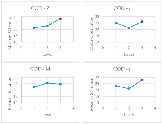 Analysis of the data shows, as can be seen in Figure 10, that for the following values: Z3, i3, M2; and t3, i.e., the largest zeolite SZ particles used, the highest current density used, Al electrodes, and after 30 min the highest COD decrease should be achieved. The highest turbidity removal should be achieved at the following values: Z3, i2, M2; and t2, i.e., the largest zeolite SZ particles used, the medium current density used, Al electrodes, and after 20 min. The analysis of the optimal values for both results shows the following: the highest COD and turbidity decrease is achieved with a zeolite particle size of 160–600 µm and with Al electrodes. In addition to analysing the optimal level of the factors, their effect on the mean values and SN ratios was also investigated. As can be seen from Table 6 and Table 7, the effects of the studied parameters on COD and the reduction in turbidity are completely opposite. The results show that in the optimization of two responses, the final selection of the optimal parameters cannot be based only on the Taguchi results. Regarding current density and contact time, some other factors, such as energy and electrode costs, must be considered before a final decision is made.