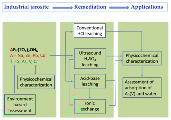 The jarosite (JAR) used in this work was an industrial residue recovered from an Mexican electrolytic zinc refinery. Samples of the jarosite paste taken at the filter press’s output were collected in a 200 L metal container. The coning and quartering method was used to obtain a representative sample of 20 kg with an average moisture content of 35.5 wt. %. Additionally, a second jarosite sample was acquired from the same refinery in 2017 (RJAR) and used for specific studies. Figure 1 illustrates the approach utilized to obtain As(V) and water adsorbents from a jarosite residue. The strategy consists of a series of stages that involves the determination of the physicochemical properties, assessment of the environmental risks that industrial jarosite can represent if it is not appropriately handled, the study of alternatives to leach heavy metals that make jarosite dangerous, and the evaluation of remediated jarosites to be applied in a productive process.