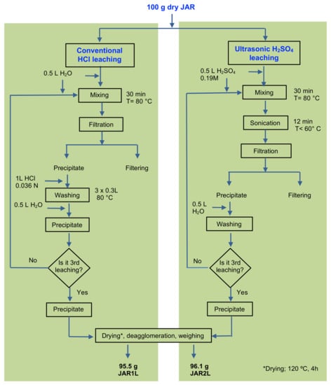 The aim of the JAR remediation in this study is to reduce heavy metal content at the lowest possible temperature, shortest time, and pH between 2 and 10. The water-soluble salts were leached using acid leaching and the heavy metal cations that neutralize the jarosite surface were removed using an ion exchange process. Both approaches used ultrasound and microwaves to achieve high efficiency at mild reaction conditions []. Figure 2 shows the strategies for acid remediation of JAR.