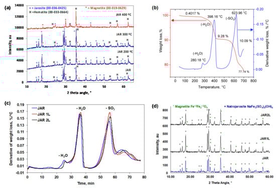 According to the mineralogical analysis, JAR is mainly constituted by natrojarosite (NaFe3(SO4)2(OH)6 • n H2O), hardly appreciable quantities of magnetite (Fe+2Fe2+3O4) and hematite. Figure 3a shows the XRD pattern of JAR, which is characterized by high-intensity diffraction peaks at 29.1, 28.6, and 17.5° of 2θ. It also presents medium-intensity peaks at 49.7, 45.8, 40.24, 15.8, and 14.8° of 2θ and other low-intensity peaks. The mineralogical phases observed in both JAR, JAR1L, and JAR2L are the same as those reported for this type of materials [,,].