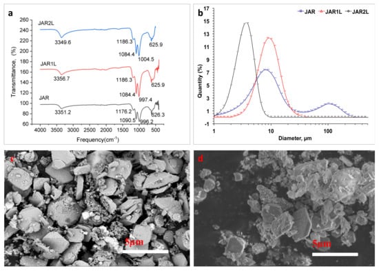 Jarosites characterization. (a) FTIR Spectra; (b) particle size distribution; (c) JAR micrograph; (d) JAR2L micrograph.
