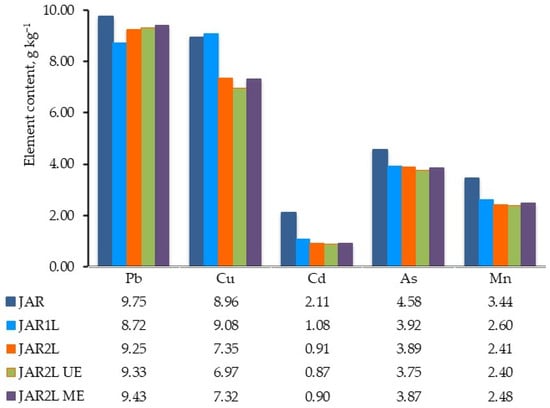 The results obtained from the hot water (80 °C) extraction process are consistent with the solubility properties of the salts of the elements contained in the JAR. The higher the temperature, the higher the solubility of the salts []. Regarding the total content of the extracted elements, the extraction of Mn (100%), Zn (99.18%), Cu (91.43%), and Cd (96.53%) is favored with water. While Pb (97.0%) and As (47.63%) extraction occur more efficiently in the acid extraction.