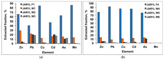 In the case of the filtrate obtained from the extraction with hot water (JAR1L F1), a higher content of Zn (65.59%), Cu (84.28%), and Mn (85.54%) was found. The solution from the first washing (JAR1L W1) contains almost the rest of these metals. This means that to extract most of the leachable salts of these metals from JAR, single leaching and one washing are enough. On the contrary, the Pb, Cd, and As were distributed between the filtrate and the washing solutions (JAR1L F1 and JAR1L Wn; n = 1, 2, 3). This means that the more water used to extract these, the greater the efficiency of removing these elements. Figure 6a shows the percentage fraction of the extracted elements that remained in the filtrates (Fn) and the solutions of the first three washes (Wn) resulting from the hot water leaching. Figure 6b shows the JAR leaching results with the HCl solution and washing with hot water.