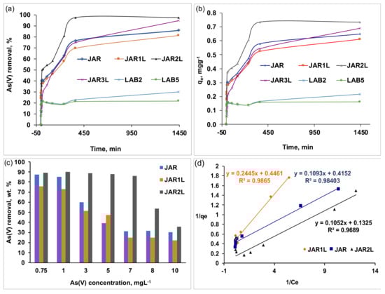 The equilibrium of As(V) adsorption observed in jarosites that were obtained by JAR remediation is summarized in Figure 7c. Moreover, JAR2L stands out because it removes 90% of the As(V) contained in solutions of up to 7000 µg L−1. By analogy between the linear representation of the Langmuir isotherm (Equation (4)) and the equations of the trend lines shown in Figure 7d, the values of the maximum theoretical adsorption capacity of As(V) by JAR, JAR1L, and JAR2L are 2.24, 2.41, and 7.55 mg g−1, respectively.