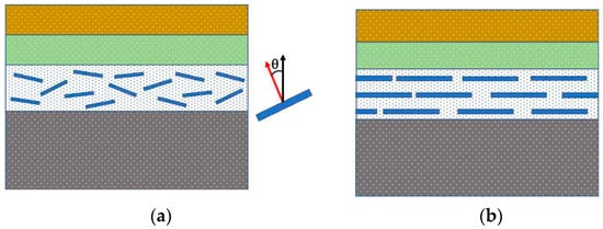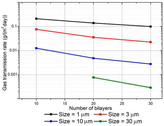 Two types of clay–polymer nanocomposite films are possible, as shown in Figure 1: nanocomposites with a more or less random orientation of the clay fillers (Figure 1a), and systems with an enforced orientation order of the clay particles (Figure 1b). The first structure can be obtained by mixing polymer/clay in solution or melting followed by film formation. The second can be obtained, for example, by the layer-by-layer deposition method, where the substrate is sequentially treated with anionic and cationic aqueous solutions of polymers and clay particles [37], which eventually leads to the formation of the nanolaminate structure [38]. Experimental studies have shown that such materials have very low permeability. In particular, less than 0.005 cm3/(m2∙day) for oxygen has been demonstrated [37].