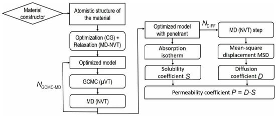 One of the most widely used theoretical approaches to estimate the transport properties of polymeric materials is atomistic modeling based on a combination of molecular dynamics and Grand Canonical Monte Carlo (GCMC) [66,67,68,69,70]. The implementation of this scheme is shown in Figure 2.