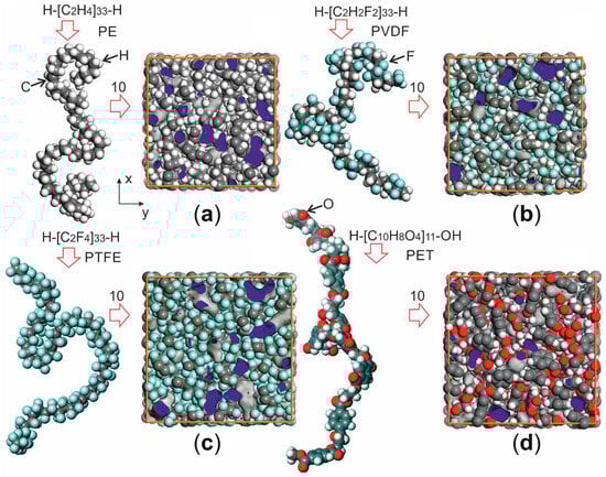 Polymer matrices were prepared using constructor modules (integrated into our previously developed MULTICOMP package [48]) and the Class II Polymer Consistent Force Field (PCFF) [77]. Polymer chains were constructed using the “Polymer Chain” module. The degree of polymerization of the chains was set to 33 for PE, PTFE, PVDF, and 11 for PET. The length of the polymer chains was chosen so that each chain contains approximately 200 atoms, as this value is sufficient to predict the transport properties of polymers [78]. The samples of matrices were then obtained from 10 polymer chains using the “Polymer/Composite Constructor” module. They were subjected to geometry and relaxation optimization to bring them to an equilibrium state (T = 300 K), and an additional 100 ps annealing step was used in the NVT ensemble with an Andersen/Behrendsen thermostat [79,80]. The models of the polymer chains and sample matrices are shown in Figure 3.