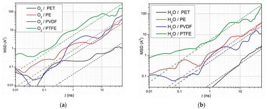 Calculated MSD curves obtained for (a) oxygen and (b) water molecules for PET, PE, PVDF, and PTFE at 300 K. Each curve is the result of averaging 10 MD runs. Dashed lines show the value of the diffusion coefficient estimated by a linear approximation.