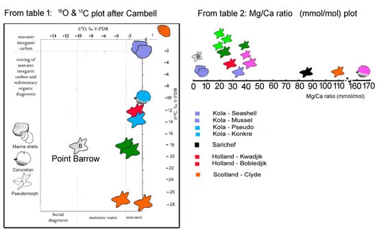 - Geptner, A.R.; Vetoshkina, O.S.; Petrova, V.V. New data on the composition of stable isotopes in glendonites of the White Sea and their genesis. Lithol. Miner. Resour. 2014, 49, 473–490. [Google Scholar] [CrossRef]