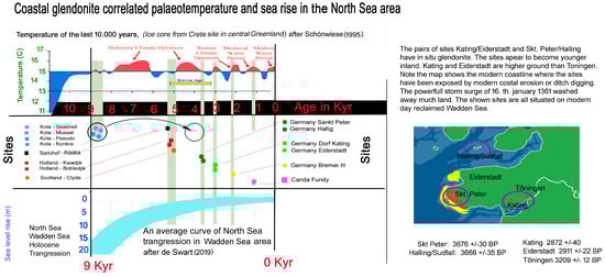 - Behre, E. A new Holocene sea-level curve for the southern North Sea. Boreas 2007, 36, 82–102. [Google Scholar] [CrossRef]