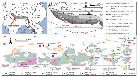 The Tibetan Plateau, from north to south, can be divided into the Qiangtang terrane, Lhasa terrane, and Himalayas, which are separated by the Jinsha (JSSZ), Longmu Tso-Shuanghu (LSSZ), Bangong–Nujiang (BNSZ), and Yarlung Zangbo (YZSZ) suture zones, respectively (Figure 1b) [34]. The Lhasa terrane can be further subdivided by the Shiquan River–Nam Tso Mélange Zone (SNMZ) and the Luobadui–Milashan Fault (LMF) into the northern, central, and southern subterranes, according to the differences in the basement rocks and sedimentary cover (Figure 1b) [35]. The central Lhasa subterrane is mainly covered by Mesozoic and Cenozoic sedimentary units, as well as a large amount of dispersed Mesozoic–Cenozoic volcanic sedimentary rocks [35,36,37]. The Mesozoic–Cenozoic sedimentary units mainly contain Paleocene–Eocene collision-related granitoids, with minor Late Triassic to Cretaceous subduction-related arc granitoids [38,39]. The Mesozoic and Cenozoic volcanic–sedimentary rocks are predominantly composed of the lower Cretaceous Zenong and Duoni Formations [40,41], and the Paleocene–Eocene Linzizong volcanic successions [42,43]. Granitoids are widespread in the GMB [44] and, in particular, in the huge plutonic belt, i.e., the Gangdese batholith. Previous studies revealed that the Gangdese batholith was active from the Late Triassic to the Miocene, with three magmatic peaks, i.e., Late Jurassic (ca. 170–150 Ma) [45], Early Cretaceous (ca. 125–100 Ma) [46], and Paleocene–Eocene [36,47]. Several pulses of magmatic activities occurred during the Oligocene–Miocene, Paleocene–Eocene, and Cretaceous periods [48]. There are mainly three identified mineralization phases: (1) The Neo-Tethys subduction-related mineralization event between 180–160 Ma, the Xiongcun porphyry Cu-Au deposit [49,50], (2) the India–Asia collision-related Mo-Cu-Pb-Zn mineralization event between 65–40 Ma, the Tangbula and Sharang porphyry Mo deposits [51], and the Mengya’a skarn Pb-Zn deposits [52], and (3) the India–Asia post-collision-related porphyry–skarn mineralization event between 20–10 Ma, including the Jiama, Qulong, Bangpu, Chongjiang, Tinggong, Zhunuo, and Jiru Cu-Mo deposits [53,54,55]. The mineralization was formed in different environments, from the Jurassic setting to the Cenozoic continent–continent collision environment [56]. Moreover, the Miocene Cu mineralization was mainly formed at 18–12 Ma, in a post-collision environment associated with the uplift and exhumation of the Gangdese batholith (21–18 Ma), E–W crustal extension (18 Ma), and N–S-striking normal faults (23–14 Ma) [57].