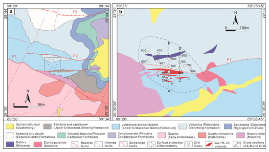 Regional geological map of the Pusangguo district (a), and simplified geological map of the Pusangguo deposit (b), modified from [14].
