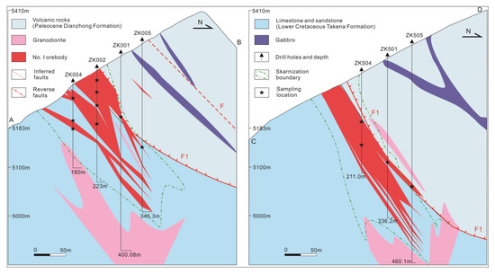 North–south geologic cross-section (A–B and C–D are shown in Figure 2b) of the Cu–Zn–Pb orebody in the Pusangguo deposit.
