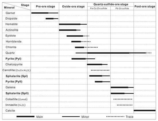 Four mineralization stages have been recognized, based on the hand specimen, the mineral assemblage, and the crosscutting relations (Figure 4). These four stages mainly include the pre-ore stage, oxide-ore stage, quartz–sulfide-ore stage, and post-ore stage (Figure 6). Moreover, the quartz–sulfide-ore stage can be further subdivided into the Fe-Cu-Zn sulfide and Pb-Zn sulfide substages. The pre-ore stage features island and chain anhydrous silicates, such as garnet and diopside. Garnet, essentially of the andradite–grossularite series (And47.39–98.17Gro0.59–50.22) [11], is the dominant prograde mineral in the pre-ore stage, and usually occurs as independent massive aggregates (Figure 4a and Figure 5a). Clinopyroxene, with the composition of hedenbergite–johannsenite–diopside (Hd37.91–74.16Jo0.91–61.66Di0.43–46.07) [11], occurs mainly as discrete massive aggregates, with euhedral to subhedral crystals (Figure 5b). Subsequent hydrothermal fluids have altered clinopyroxene into actinolite (Figure 5c). The oxide-ore stage is dominated by hematite (Figure 5d), with other retrograde minerals including epidote (Figure 5e), actinolite, chlorite, hornblende, quartz, and pyrite (PyI). The PyI grains mainly occur in euhedral aggregates coexisting with chalcopyrite (Figure 5f). The sulfide-ore stage has abundant sulfides, including chalcopyrite, pyrite, carrollite, sphalerite, galena, cobaltite, and linnaeite with quartz. The Fe-Cu-Zn sulfide substage is dominated by chalcopyrite, sphalerite (SpI), pyrite (PyII), and quartz, with minor amounts of carrollite. The carrollite occurs before, or is coeval with, the chalcopyrite [12]. The PyII grains are usually subhedral aggregates, and are replaced by chalcopyrite (Figure 5g). The SpI grains are mainly dark brown, with the internal reflection color of red–brown, forming the exsolution structure with chalcopyrite (Figure 5h,i). The Pb-Zn sulfide substage is characterized by sphalerite (SpII) and galena, with minor amounts of cobaltite and linnaeite. The cobaltite and linnaeite mostly occur with sphalerite, or surrounded by sulfide [12]. The SpII grains are yellow–brown, with the internal reflection color of yellow, which is primarily associated with galena (Figure 5j–l). Low-temperature calcite and quartz veins intersect the prograde and retrograde minerals at the post-ore stage (Figure 4i).