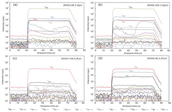 The representative LA-ICP-MS time-resolved depth profiles for sphalerite (a,b) and pyrite (c,d) from the Pusangguo deposit.