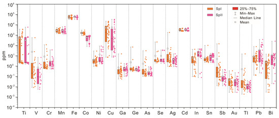The LA-ICP-MS spot analysis was performed on 44 spots for SpI, and 39 spots for SpII, and the results are shown in Table S4, and are illustrated in Figure 8. Generally, the two sphalerite types differ slightly in the content of most trace elements. Fe is the most abundant trace element (31,656–88,891 ppm, median 53,191 ppm) (Figure 8). The Mn contents in sphalerite are generally high (1317–6443 ppm, median 2531 ppm) (Figure 8). The Mn contents of SpI and SpII ranged from 1436 to 5315 ppm (median 2648 ppm), and 1317 to 6443 ppm (median 2351 ppm), respectively. The Cu content in sphalerite is relatively high, ranging from 7.35 to 33,121 ppm, with a median of 1296 ppm.