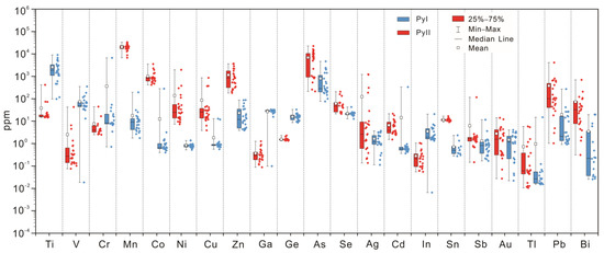 LA-ICP-MS analysis was performed on 24 spots for PyI, and 24 spots for PyII, and the analytical results are presented in Table S5 and Figure 9. The pyrite has lower contents of trace elements relative to the sphalerite. The contents of some of the elements, such as Ti, As, Co, and Mn, can be tens to thousands of ppm, but some are below 10 ppm or the detection limits (Table S5). In general, the Co contents in PyII (403–3397 ppm, median 811 ppm) are higher than those in PyI (0.4–278 ppm, median 0.65 ppm). The distributions of Ni in PyII (7.08–1874 ppm, median 23.68 ppm) are higher than those in PyI (0.53–1.38 ppm, median 0.83 ppm).