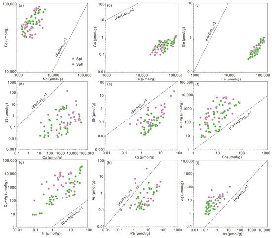 Trivalent (As3+, Sb3+, Sn3+, In3+, Ga3+) or tetravalent cations (Sn4+, Ge4+) generally combine with monovalent cations (Cu+, Ag+) to replace Zn2+ in a sphalerite lattice, via coupled substitutions [78,79]. The positive Cu vs. Sb (Figure 10d) and Ag vs. Sb (Figure 10e) correlations suggest the substitution mechanism of Sb3+ + Cu+ ↔ 2Zn2+ and Ag+ + Sb3+ ↔ 2Zn2+, respectively. Almost all the data points are on the side of the molar ratio (Sb/Cu)mol < 1 and (Sb/Ag)mol < 1, indicating that the equation is not adequate for the intake of Cu and Ag, respectively. The positive correlations between Sn, In, Cu, and Ag strongly support the coupled substitution mechanisms Sn3+ + (Cu+, Ag+) ↔ 2Zn2+ and In3+ + (Cu+, Ag+) ↔ 2Zn2+, but the Sn and In contribute less to Cu and Ag substitution, because all the points are mainly above the line with a slope of 1 (Figure 10f,g).