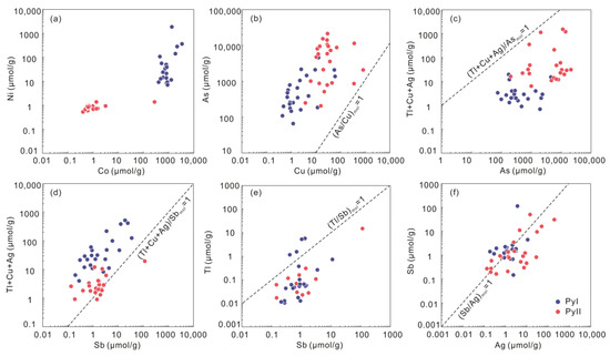 Binary plots of Co and Ni (a), As and Cu (b), As and Tl + Cu + Ag (c), Sb and Tl + Cu + Ag (d), Tl and Sb (e), Ag and Sb (f) in pyrite from the Pusangguo deposit, derived from the total dataset.