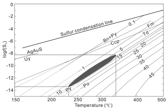 Sulfur fugacity diagram for the sphalerite from the Pusangguo deposit (modified from [99]). Abbreviations: Td, tetrahedrite; Uy, uytenbogaardtite; Fm, famatinite; Py, pyrite; Ccp, chalcopyrite; Bn, bornite; Po, pyrrhotite.