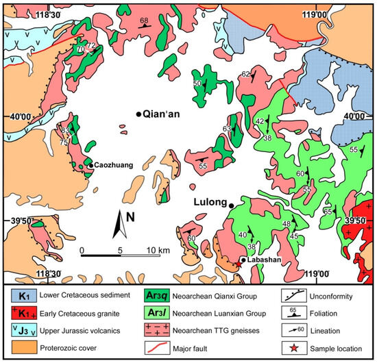 Detailed geological map of the Qian’an and Lulong areas, showing the spatial relationshios, lithology and structural features of the Archean supracrustal rock assemblage and granitic pluton.