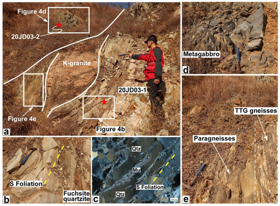Representative outcrop and microscopic images of the fuchsite quartzite in the Labashan, Lulong, eastern Hebei Province. (a) The fuchsite quartzite was intruded by the meta-gabbro. (b) Field geological characteristics of the fuchsite quartzite (Sample 20JD03-1). (c) Microscopic images showed mineral composition of the fuchsite quartzite. Abbreviations for different minerals: Qtz—quartz; Mu—muscovite. (d) Field geological characteristics of the meta-gabbro (Sample 20JD03-2). (e) Field geological characteristics of the TTG gneisses and paragneisses.