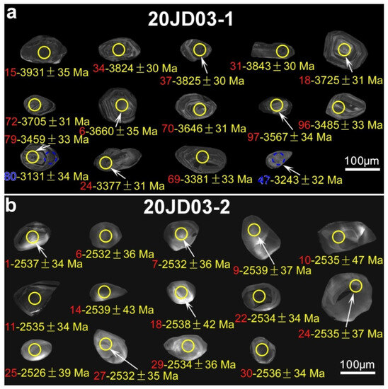 Sample 20JD03-1 was collected from a fuchsite quartzite in the Labashan, Lulong (Figure 3 and Figure 4a). The fuchsite quartzite exhibits penetrative foliation S at the field and microstructure scales (Figure 4b,c). Zircon grains extracted from the fuchsite quartzite are mostly euhedral–subhedral crystal morphologies and 100–150 μm in grain size (Figure 5a). Most of the zircons exhibit clear oscillatory zoning structure (Figure 5a), indicative of a magmatic origin. Meanwhile, they exhibit enriched LREEs ((Gd/Yb)N = 0.01–1.11), mostly negative Eu anomalies (Eu/Eu* = 0.02–0.34) and moderately to highly positive Ce anomalies (Ce/Ce* = 0.37–216.78), which further confirm a magmatic origin for these zircons (Supplementary Table S2 and Figure 6a). Only one zircon shows thecore–rim structure, where the core (Spot #79) display concentric oscillatory zoning in the CL image (Figure 5a), indicative of a magmatic origin. In contrast, zircon rims (Spot #80 and Spot #47) are relatively luminescent and lack interior structure (Figure 5a), indicative of a metamorphic origin. This is consistent with the relatively low Th/U ratios of 0.01–0.04 (Supplementary Table S1). Ninety-seven zircon grains were analyzed and plotted on the U-Pb concordia diagram (Figure 6b). Of these, two young zircons were assigned the ages of 3133 ± 34 Ma and 3243 ± 32 Ma, respectively, which represented their metamorphic ages (Figure 6b). Most of the zircons fall into the range of 3305 Ma to 3931 Ma and form five distinct age peaks (Figure 6c). The youngest single magmatic zircon age of this sample is ca. 3305 Ma (Figure 6c). The age of the Paleoarchean zircons ranges from 3371 ± 35 Ma to 3796 ± 33 Ma with the most prominent age peak of ca. 3691 Ma and the subordinate age peak of ca. 3400 Ma (Figure 6c). The Eoarchean zircon cluster ranges from 3802 ± 35 Ma to 3882 ± 33 Ma forming a peak at ca. 3828 Ma (Figure 6c). The oldest zircon age in this sample was 3931 ± 35 Ma, with only one single grain (Figure 6c).