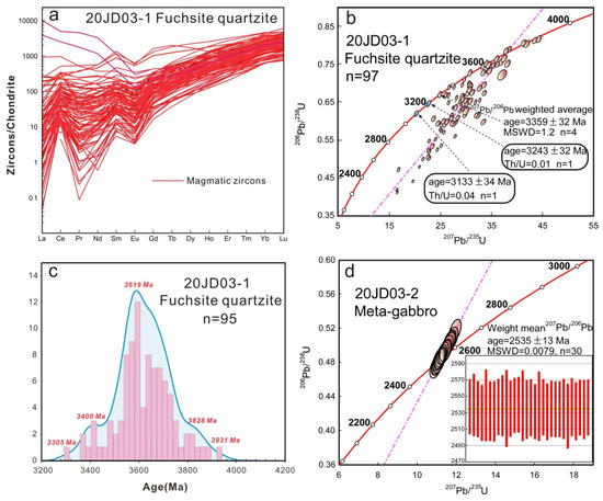 REE pattern, concordia diagrams and probability distribution of dating zircons. (a) Chondrite-normalized REE pattern for magmatic zircons from the fuchsite quartzite (20JD03-1); (b) U–Pb concordia diagram for zircons from the fuchsite quartzite; (c) Frequency distribution of the zircon age clusters of the detrital zircons from the fuchsite quartzite (20JD03-1); (d) U-Pb concordia diagram for zircons from the meta-gabbro (20JD03-2).