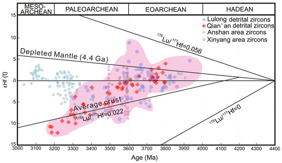 εHf(t) vs. U–Pb age diagram. The published data of the Qian’an, Anshan and Xinyang are taken from [2,55,56], respectively.