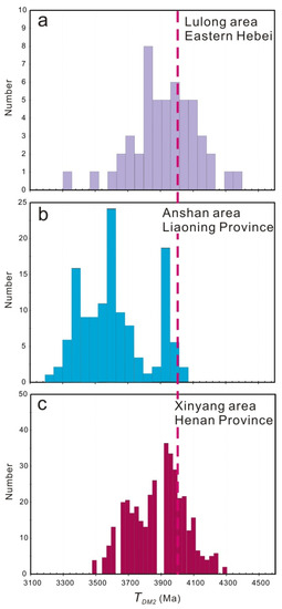 The composition, formation and evolution of the early continental crust during Hadean and Archean is a fundamental issue of Precambrian geology. It encompasses a series of essential topics, such as determining the age and tectonic framework of the oldest continental crust and identifying the crustmantle interactions that existed during that time [1,2]. The most direct method for investigating these topics is the study of the crustal materials formed during the early stages of the Earth. However, ancient crustal rocks or materials are only found in limited amounts in certain old cratons, including the ~4.02 Ga Acasta gneiss in northern Labrador, Quebec [3]; The Itsaq Gneiss Complex, Greenland [4]; Eastern Antarctica [5]; The Pilbara and Yilgarn Cratons in Western Australia [6]; And the Anshan and Lulong areas in the North China Craton [7,8,9,10]. However, the preservation of the ancient crustal rocks is limited due to the extensive reworking by later tectonothermal events. The occurrence of the ancient zircons in younger rocks is more abundant than ancient rocks, making the study of the ancient zircon grains a key component in understanding the early evolution of the Earth. Currently, the oldest zircons on Earth (4.4 Ga) have been identified in the Jack Hills, Western Australia [11]. Meanwhile, ancient zircon grains of Hadean age have also been reported in ancient craton of China.