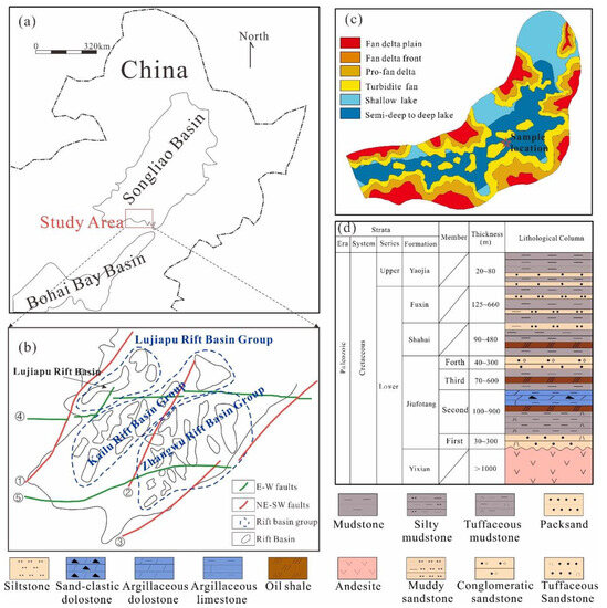 The study area is located at the southwest edge of the Songliao Basin, where the Lujiapu Rift Bsin Group, Kailu Rift Bsin Group, and Zhangwu Rift Bsin Group are developed (Figure 1a,b). The lower Cretaceous strata are classified into four formations (Figure 1d). (1) The Yixian Formation was mainly composed of andesite. (2) The Jiufotang Formation was deposited when the water level of the basin rose largely as a consequence of rapid basin sinking. At the center of the Lujiapu Rift Basin, dark shales with abundant organic matter were deposited. Around the basin, a series of turbidite fans, pro-fan deltas, fan delta fronts, and fan delta plains were formed due to the steep terrain (Figure 1c). The Jiufotang Formation, with a thickness ranging from 240 m to 1230 m, was composed of tuffaceous sandstones, tuffaceous mudstones, oil shales, and carbonate rocks. (3) The Shahai Formation was dominated by mudstones with a small amount of oil shale. (4) The Fuxin Formation was mainly composed of interbedded mudstones and siltstones (Figure 1d).