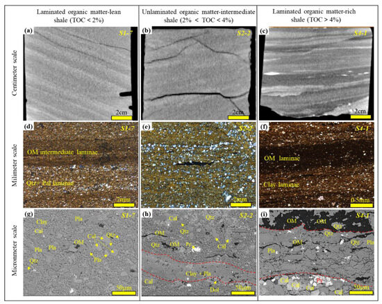 Microtextural characteristics of the three types of shales. (a) Parallel and continuous laminations from CT images. Most laminations show a thickness of 1 cm~2 cm. (b) No clear lamination is observed from CT images. (c) Curvy and continuous laminations from CT images. Most laminations show a thickness of around 1 cm. (d) OM + clay laminae combined with Qtz + Pal laminae. (e) No obvious laminae. (f) OM laminae combined with OM + clay laminae. (g) Scattered organic matter fragments. (h) Scattered and elongated organic matter. (i) Elongated and aggregated organic matter. Abbreviations: OM—organic matter, Pla—plagioclase, Cal—calcite, Qtz—quartz, Dol—dolomite, Py—pyrite.
