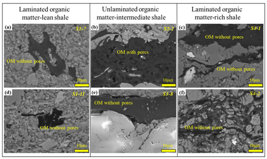 The laminated organic matter-lean and laminated organic matter-rich shales show no obvious organic pores (Figure 3a,c,d,f). This is possibly related to the specific organic matter type [32]. The unlaminated organic matter-intermediate shales develop some ellipsoidal, narrow, and irregular organic pores that are isolated from each other (Figure 3b). Most of these organic pores have a diameter less than 5 μm. Organic fractures are occasionally developed (Figure 3e), which is probably related to the shrinkage or dehydration of organic matter at some thermal maturity [3,32]. The widths of organic fractures are estimated to be less than 2 μm (Figure 3e). Overall, organic pores and fractures are not very common in the studied samples.